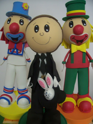 Personagens para mesa: Elefante, leão, foca, mágico, Patati e Patatá.